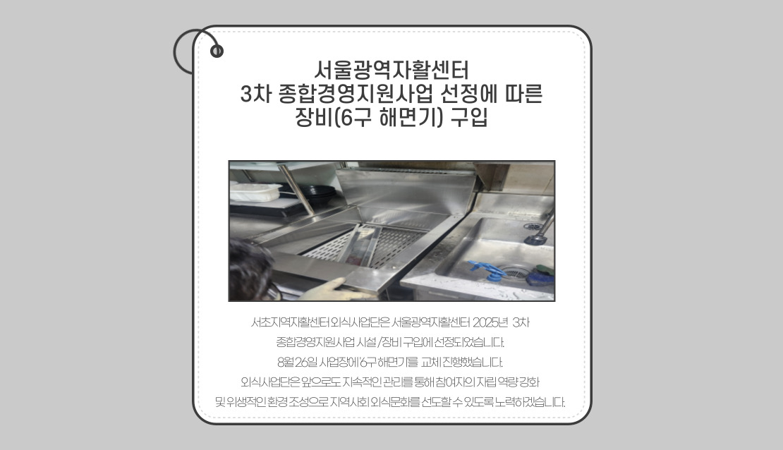 서초지역자활센터 외식사업단은 서울광역자활센터 2025년 3차 종합경영지원사업 시설/장비 구입에 선정되었습니다.